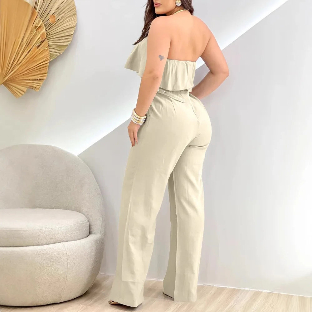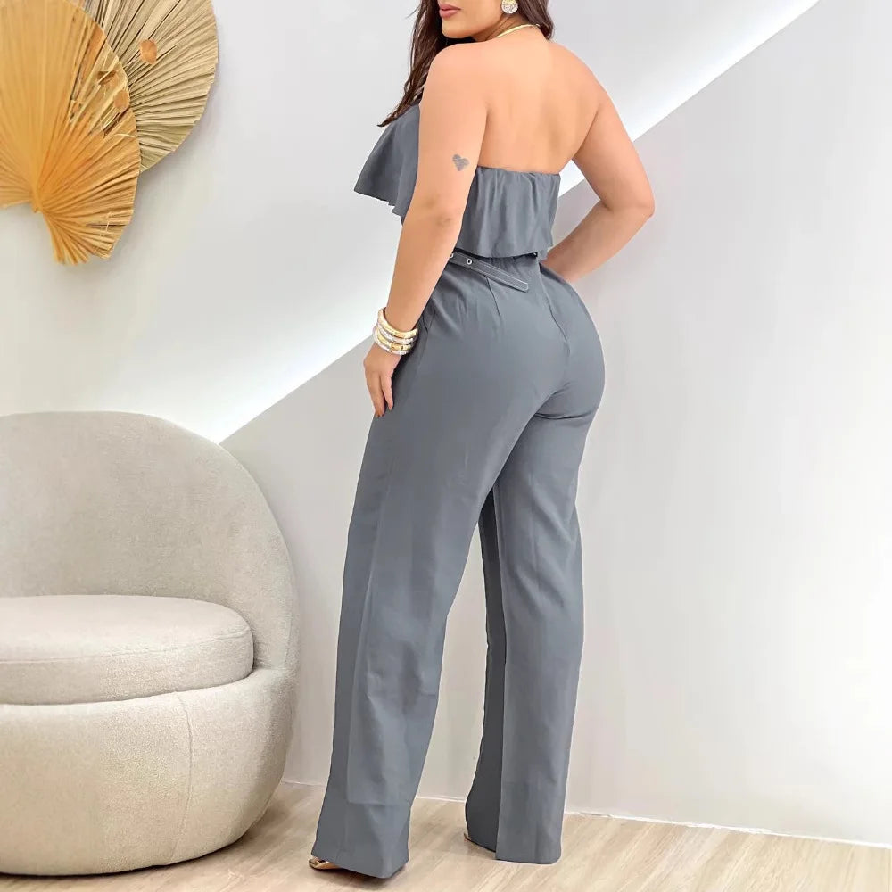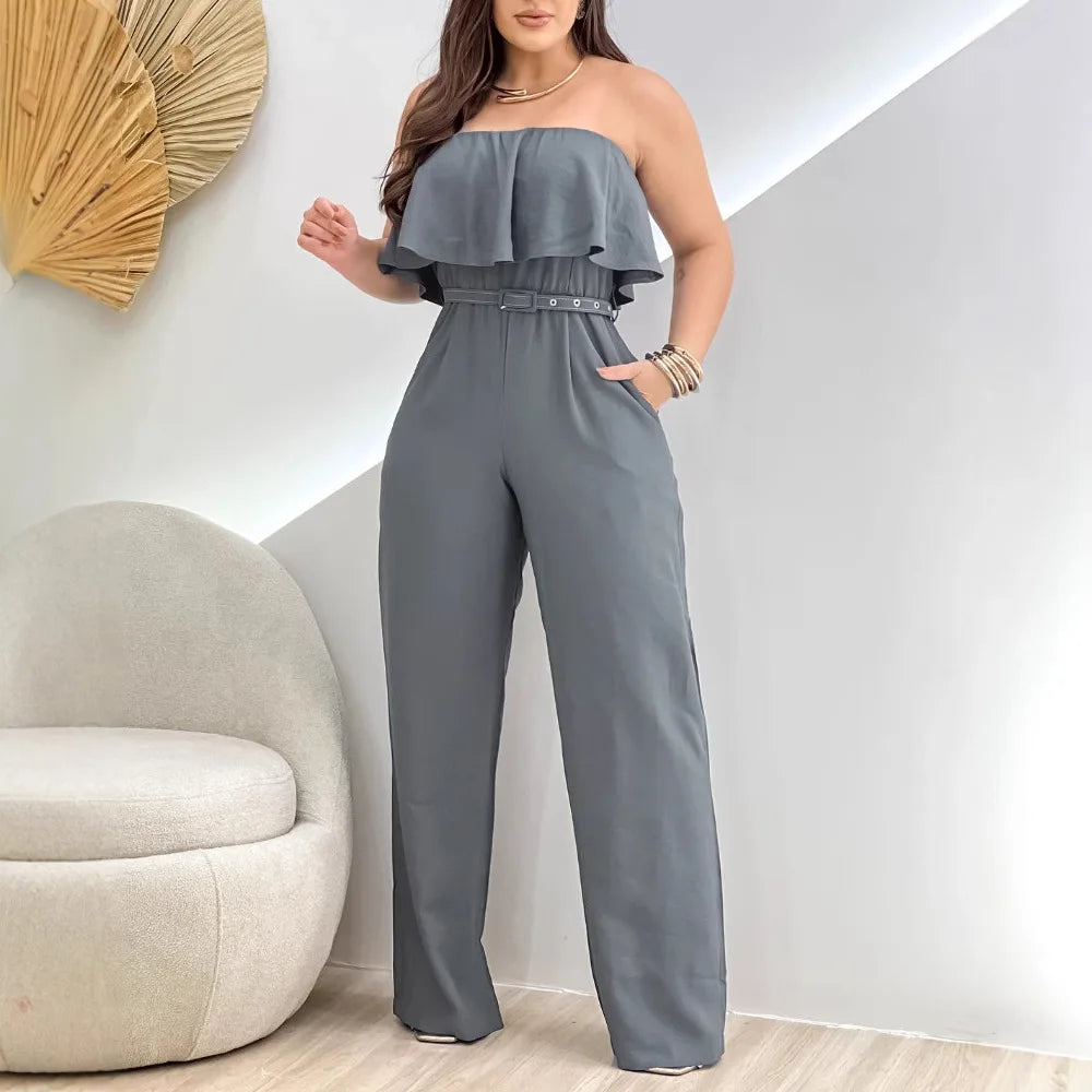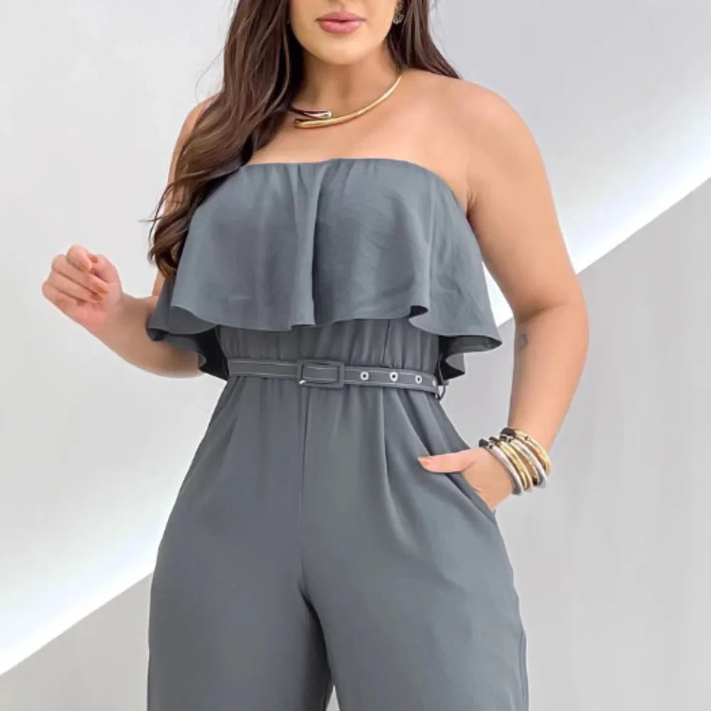 Elegant Jump Suits for Women Streetwear New Summer 2025 Fashion Pullover Solid Color Off Shoulder Ruffle Belt Bodysuit Pants