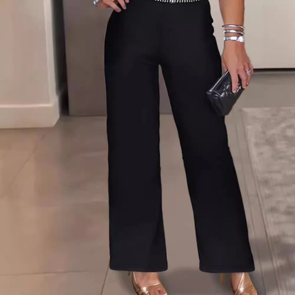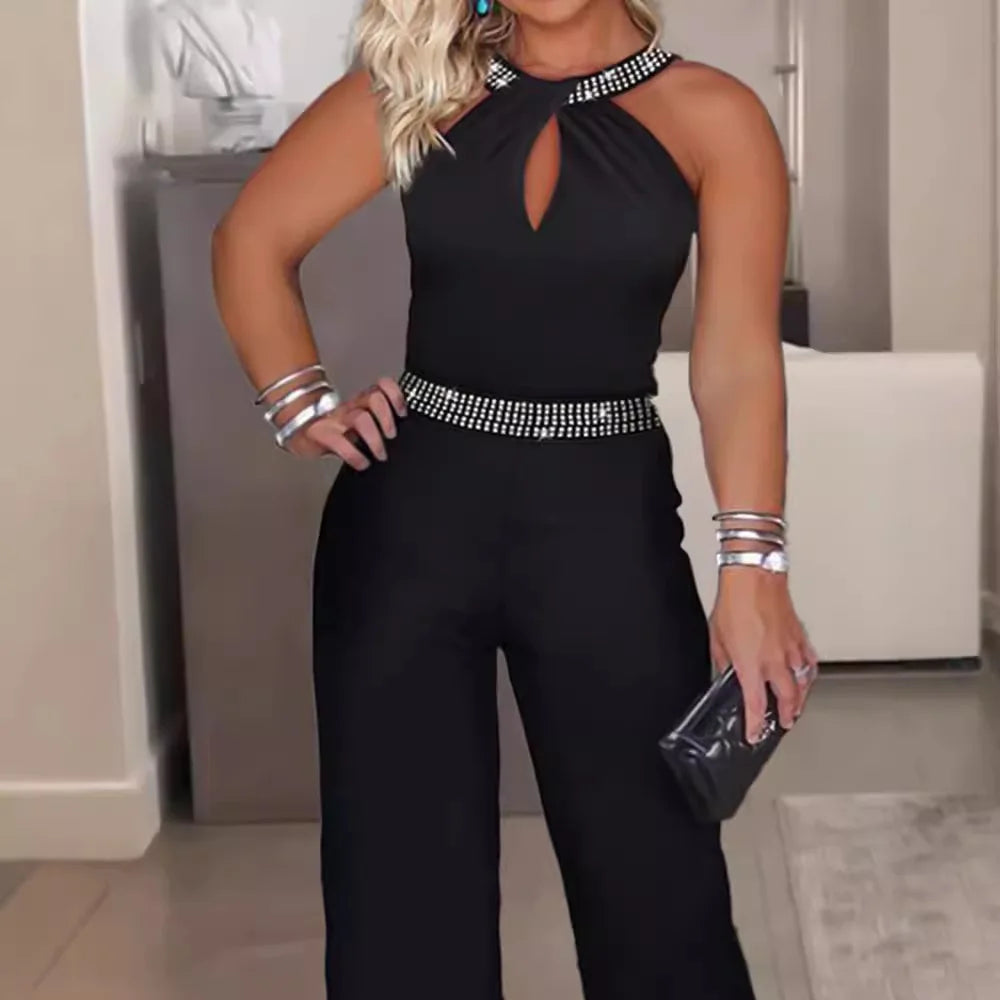 Long Jumpsuit Woman Elegant Sexy Rhinestone Sleeveless Chain Decor Fashion Casual One Pieces Conjoined Body Pants Summer 2024