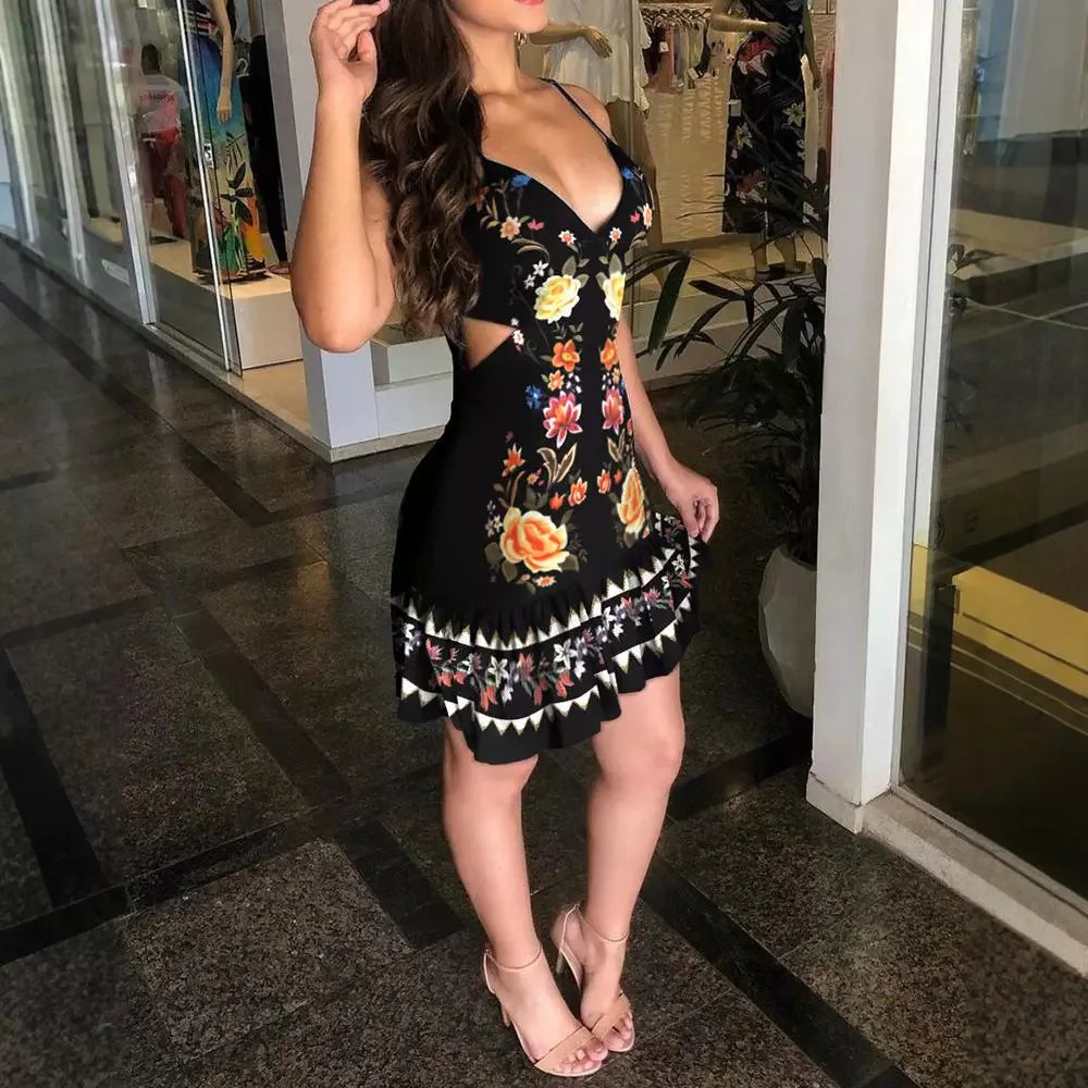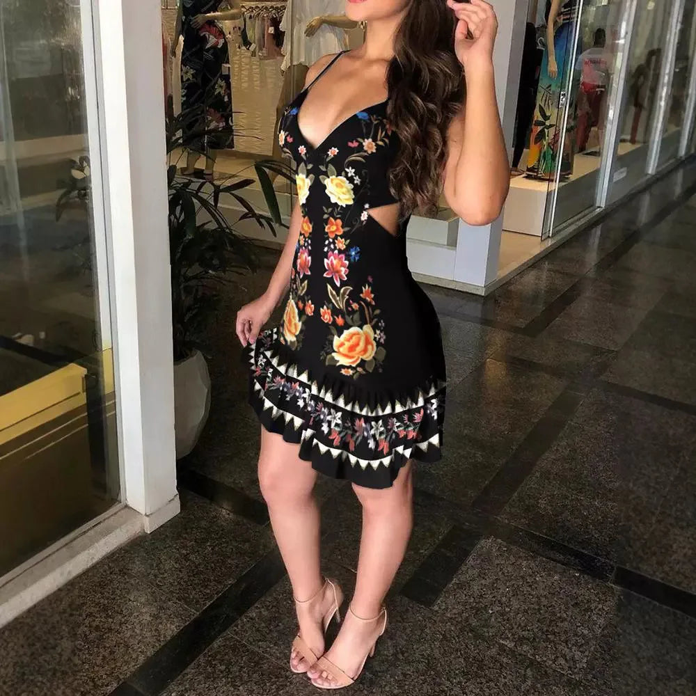 Sexy Dress for Women New Fashion 2024 Summer Elegant Hollow Suspender V-Neck Exposed Waist Printed Dresses Casual Short Skirt