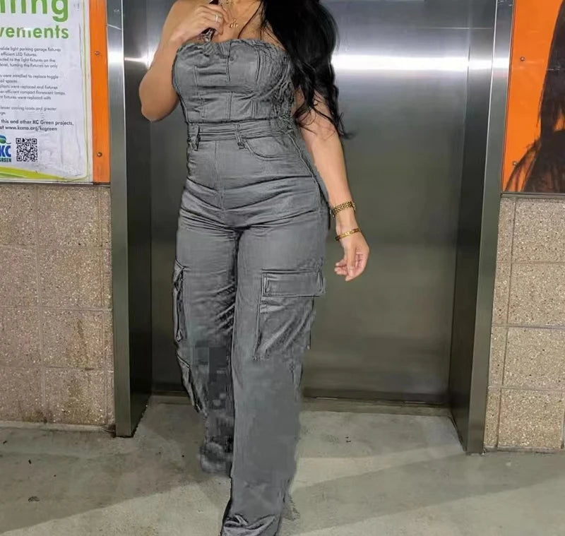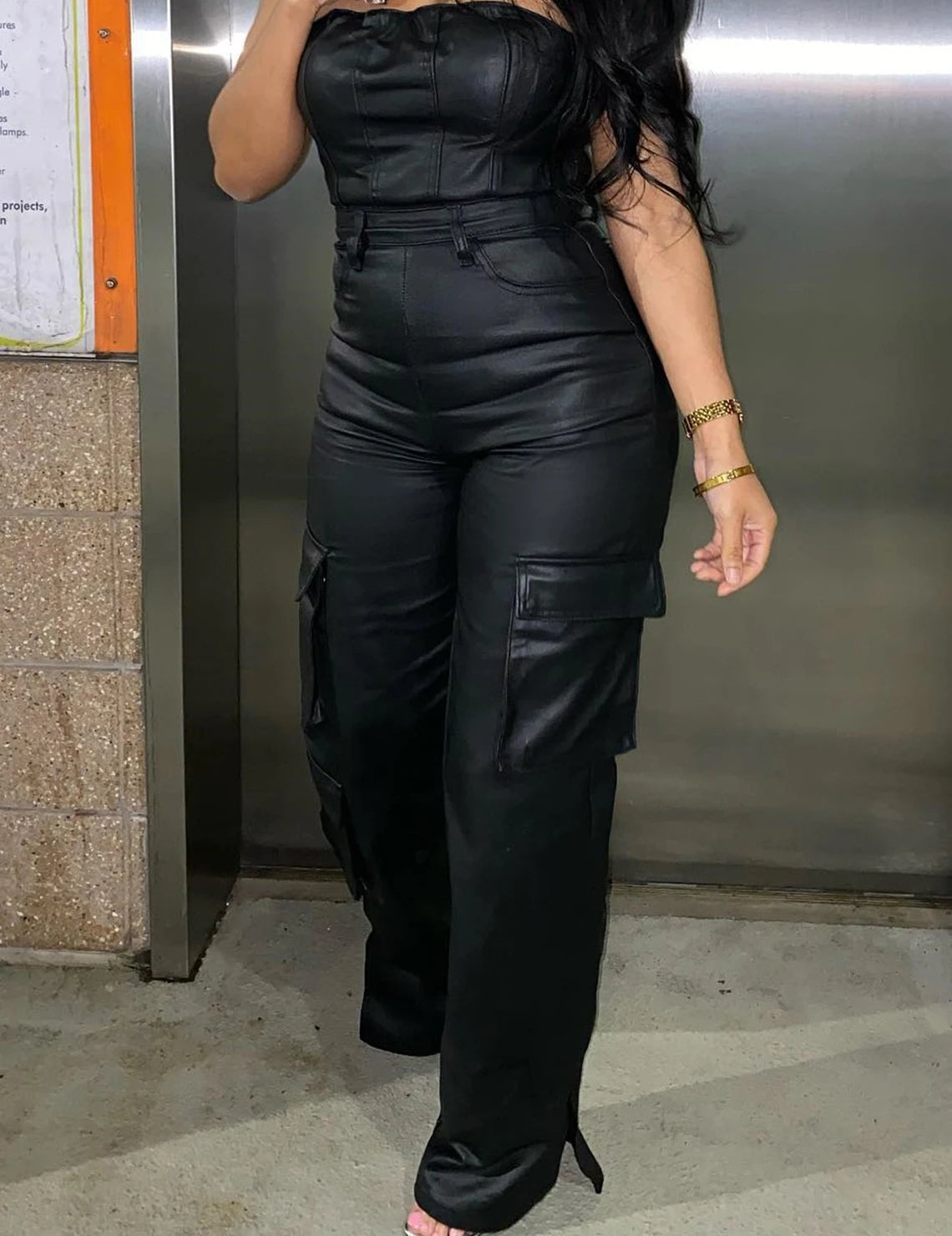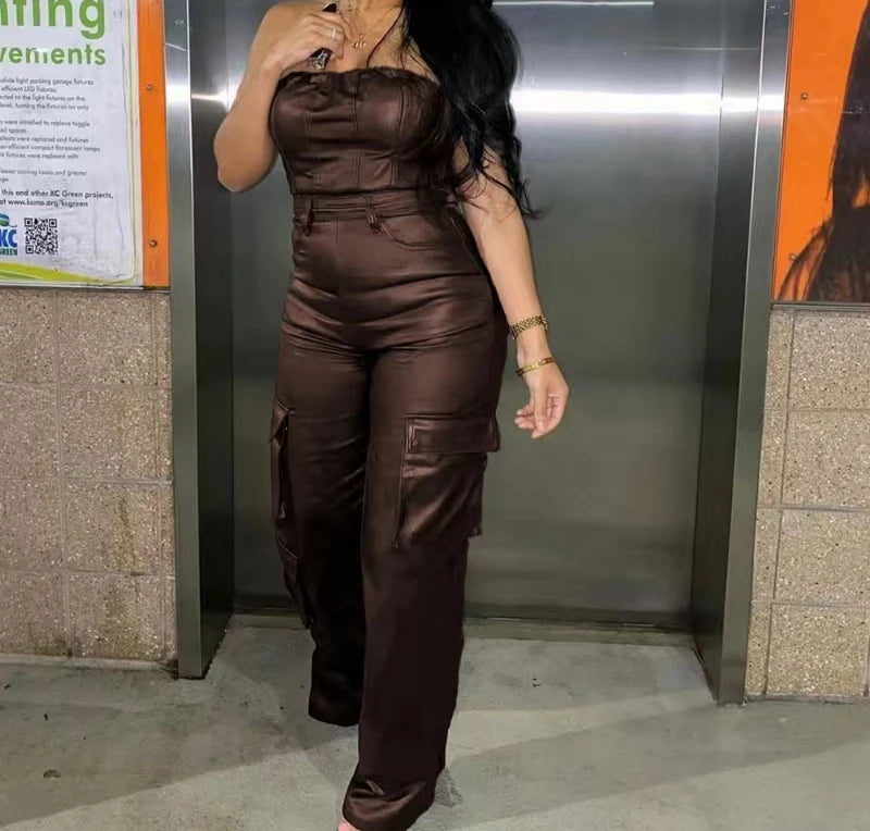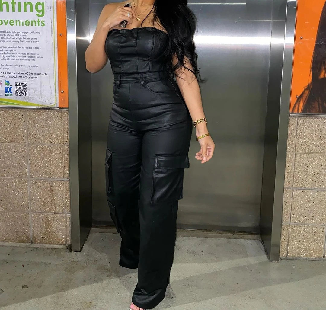 Sexy Woman Jumpsuit Streetwear 2024 Summer New Off Shoulder Strapless Tight Fitting Sleeveless PU Leather Jump Suits for Female
