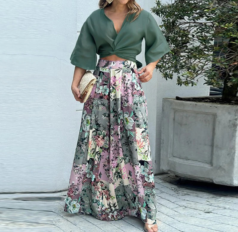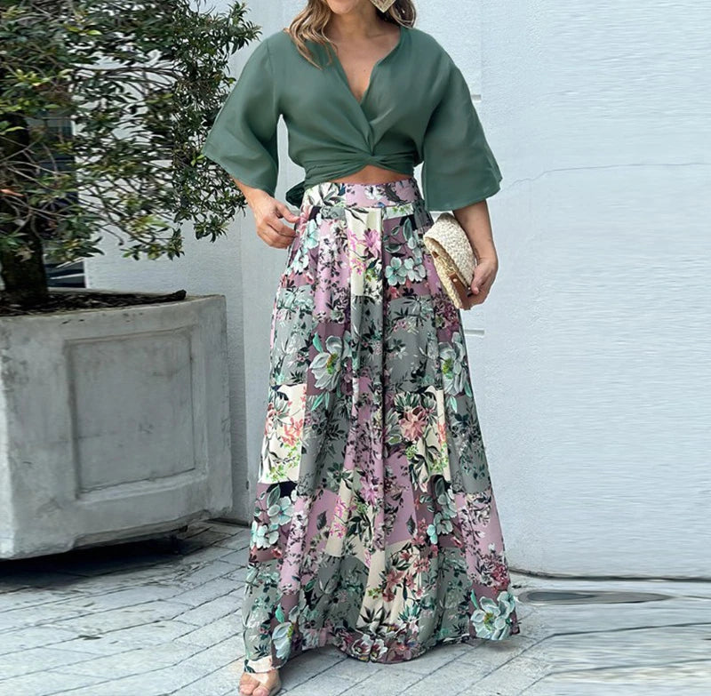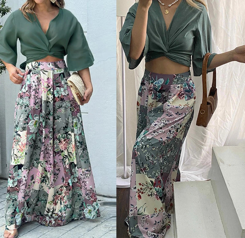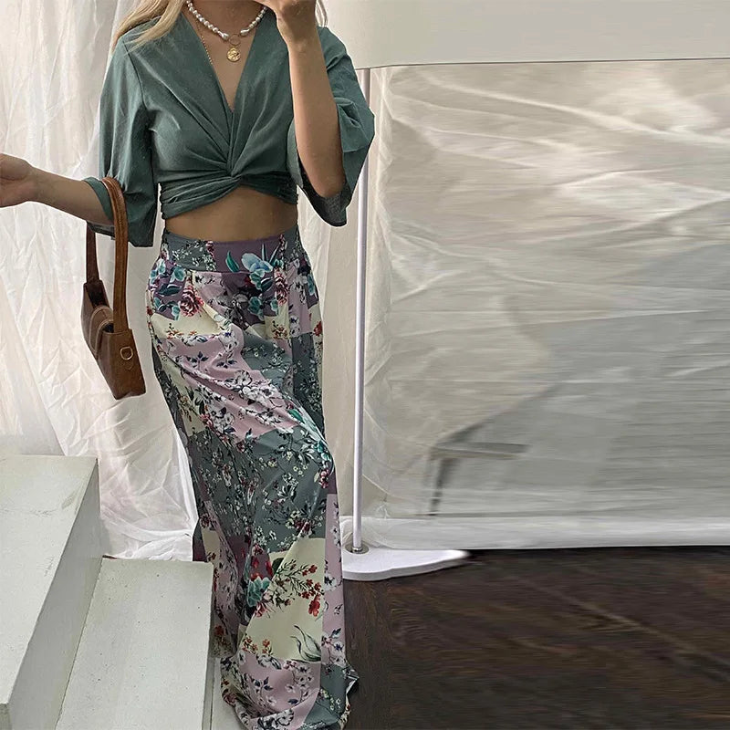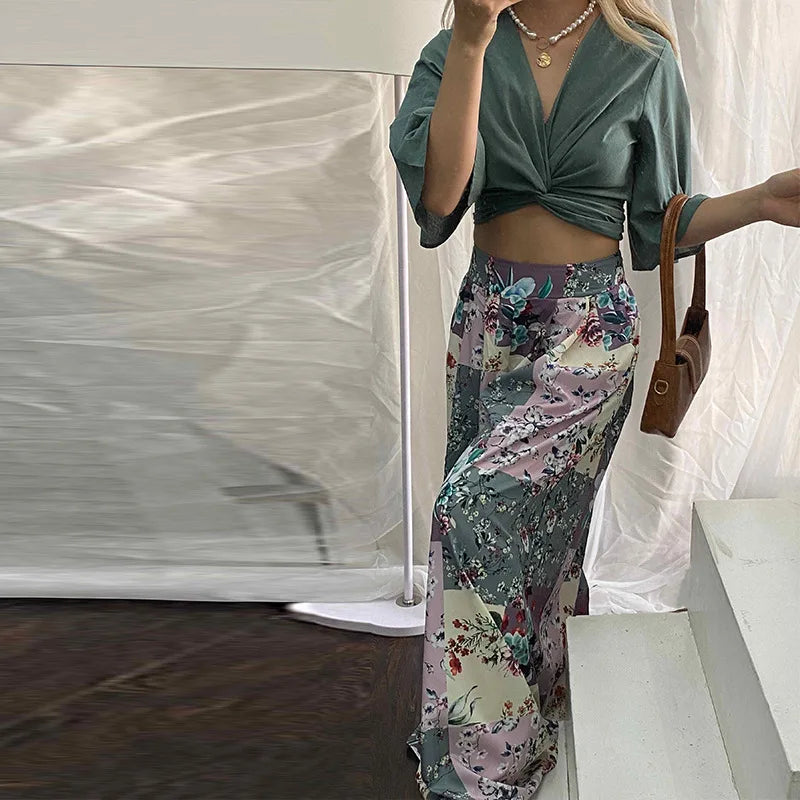 Two Piece Sets Womens Outifits Fashion Versatile Twisted Navel Top and Floral Printed Wide Leg Pants Suit for Female Summer 2024