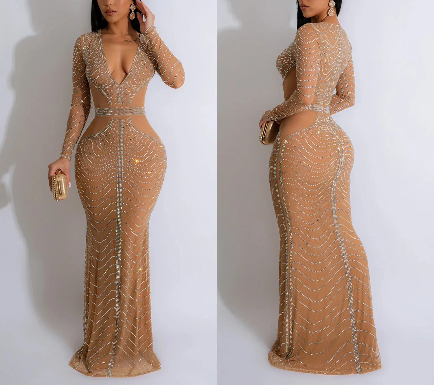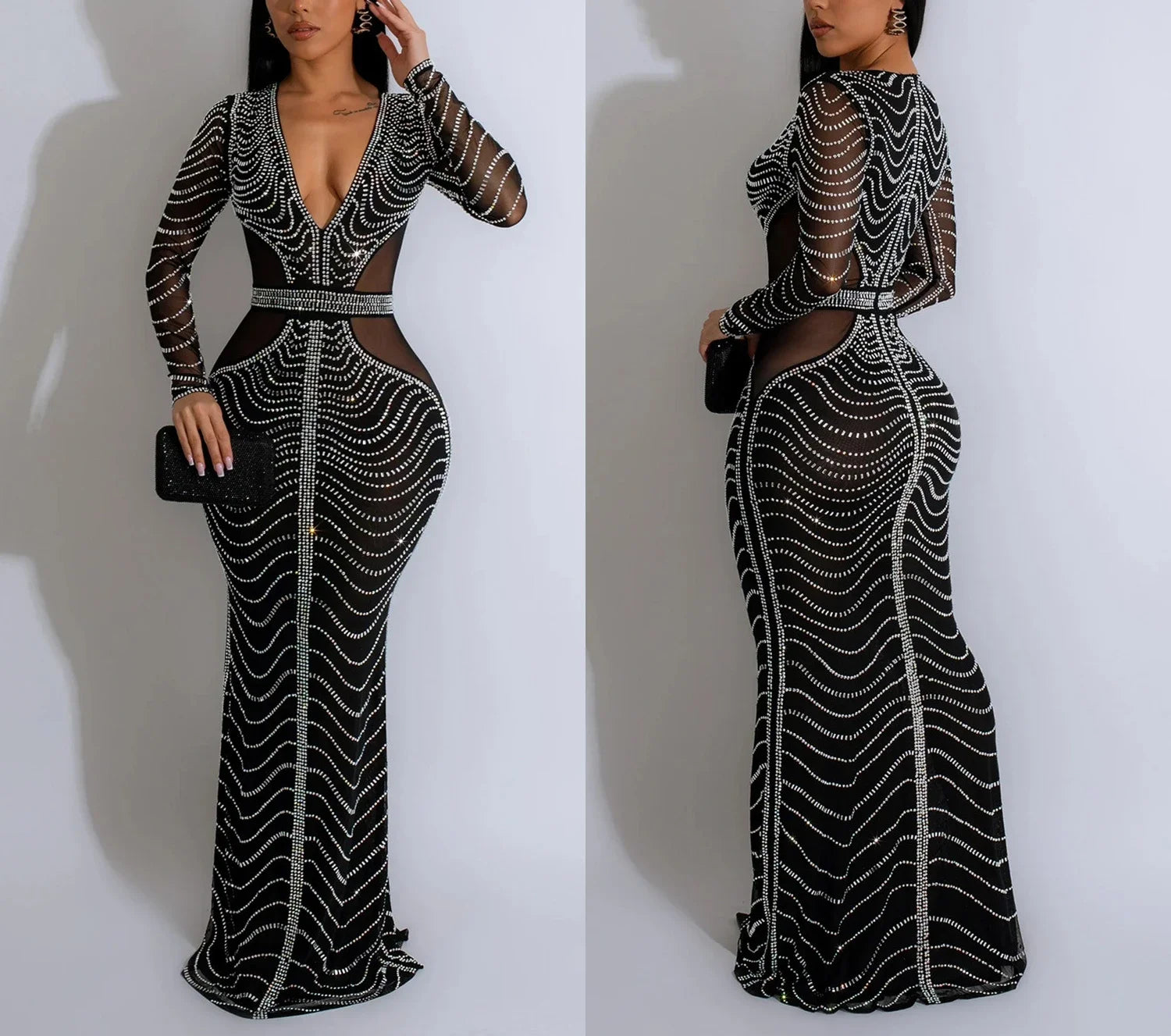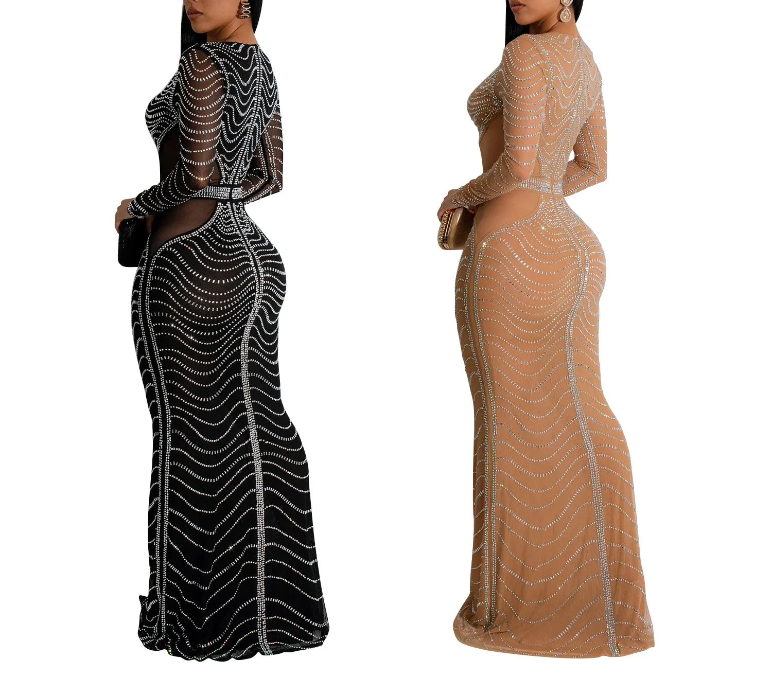 Women's Sexy Dress Streetwear Fashion Solid Mesh Rhinestone Long Skirt Elegant Y2k Dresses for Female Autumn Winter 2024 New